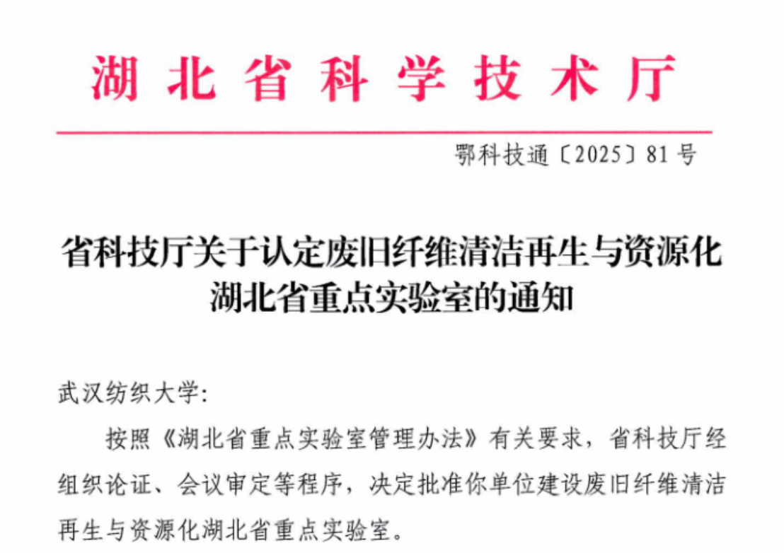 近日,湖北省科学技术厅正式发文,批准武汉纺织大学建设“废旧纤维清洁再生与资源化湖北省重点实验室”(以下简称“重点实验室”)。这是学校在服务国家“双碳”战略和“美丽湖北”建设方面取得的又一重大突破,标志着我省在纺织废弃物循环利用领域迈入高水平科研平台建设新阶段。