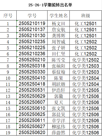 化学大类拟同意转出13名同学,化学工程与工艺拟同意转出6名同学。