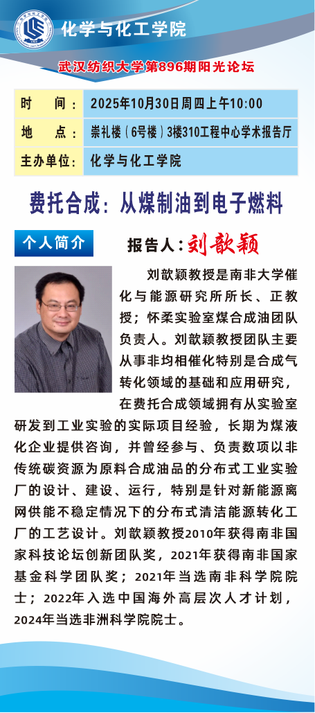 刘歆颖教授是南非大学催化与能源研究所所长、正教授,怀柔实验室煤合成油团队负责人。刘歆颖教授团队主要从事非均相催化特别是合成气转化领域的基础和应用研究在费托合成领域拥有从实验室研发到工业实验的实际项目经验,长期为煤液化企业提供咨询,并曾经参与、负责数项以非传统碳资源为原料合成油品的分布式工业实验厂的设计、建设、运行,特别是针对新能源离网供能不稳定情况下的分布式清洁能源转化工厂的工艺设计。刘歆颖教授2010年获得南非国家科技论坛创新团队奖,2021年获得南非国家基金科学团队奖,2021年当选南非科学院院士,2022年入选中国海外高层次人才计划,2024年当选非洲科学院院士。