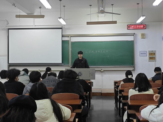 论坛伊始,学院团学工作指导老师程文杰进行了重要发言。程文杰首先详细介绍了学院本科生导师制建设情况,强调这一制度旨在为学生提供更精准、更个性化的学术指导,助力学生在本科阶段打下坚实的学术基础。接着,程文杰对上学年学院科研竞赛整体情况进行了全面回顾与总结,充分肯定了同学们在各类科研竞赛中取得的优异成绩,展现了学院学子积极进取、勇于探索的精神风貌。同时,程文杰鼓励大家珍惜进入实验室学习的宝贵机会,在科研实践中不断提升自己的专业素养和创新能力。