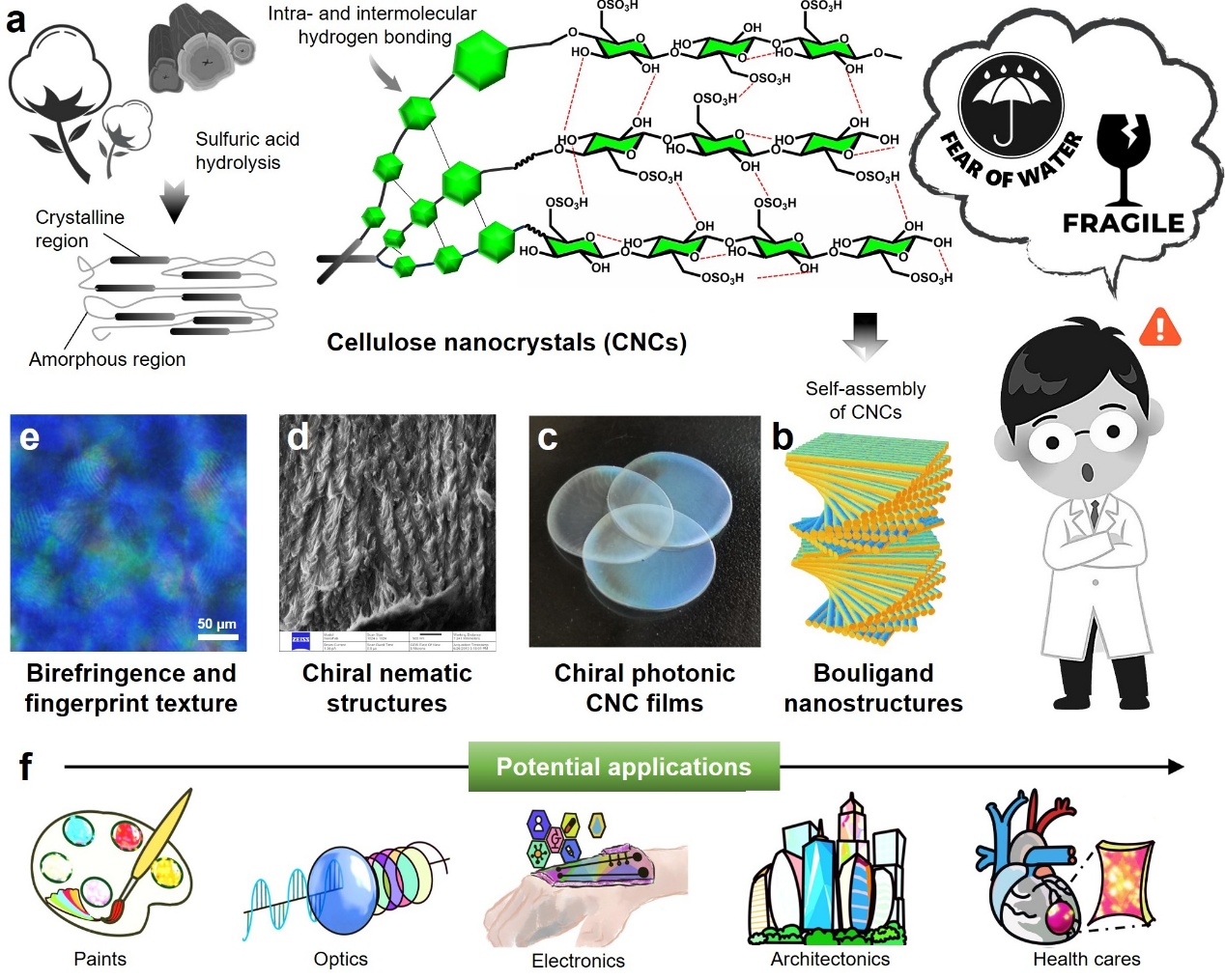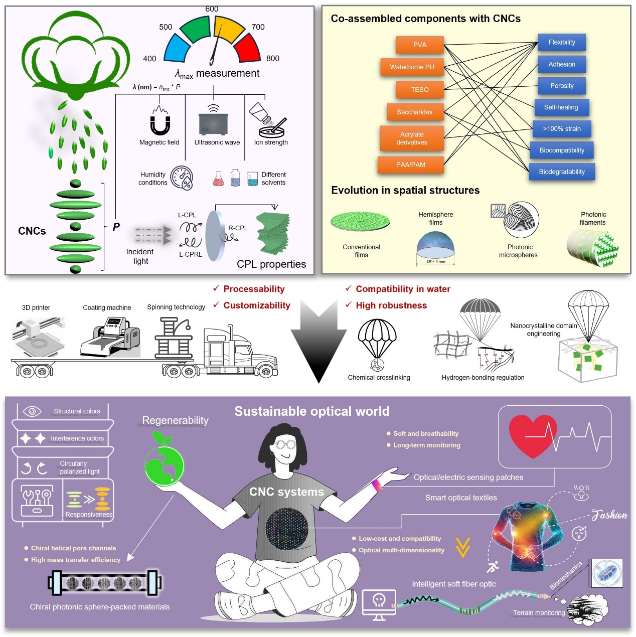 Cellulose nanocrystals (CNCs), as a green and renewable nanomaterial, exhibit outstanding chiral optical properties and structural color effects, demonstrating significant potential in fields such as photonic crystals, sensor devices, and optical anti-counterfeiting (Figure 1). However, their inherent hydrophilicity and mechanical brittleness limit practical applications in humid environments and under mechanical loading. This review systematically summarizes recent research progress in enhancing the environmental stability and mechanical properties of CNC materials through matrix engineering strategies.